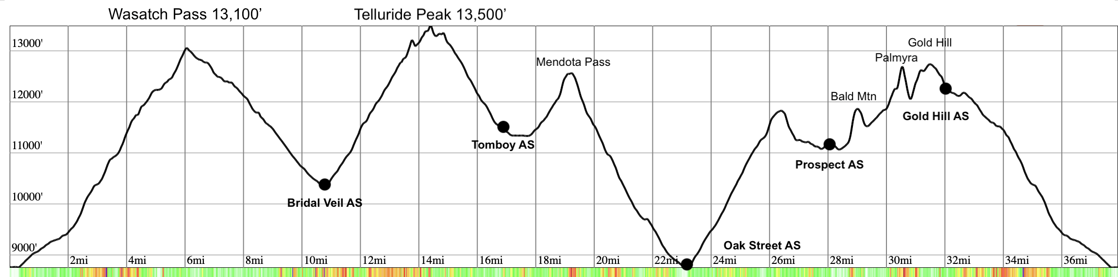 The course includes 1.5 miles of sharp, exposed ridgeline above 13,000 ft between Ajax Peak and Imogene Pass and includes the 13,500 ft summit of Telluride Peak along the way. We call this section the "Mile and a Half of Sky". Prepare for a difficult day in the mountains!