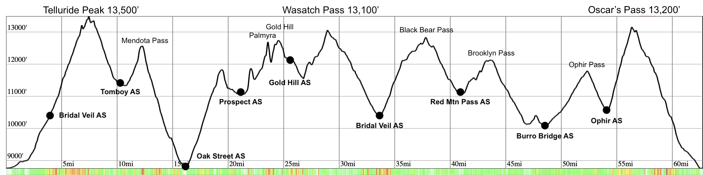 New ultra-distance run for 2026. The 65-mile run will be a challenging one! The first half of the course will run all of the same technical terrain covered in the 40-mile run but in a slightly different order. The second half of the run will cover entirely new terrain on a tour of local area passes that includes Black Bear Pass, Brooklyn Pass, Ophir Pass, and finally Oscar’s Pass before descending down through Wasatch Basin and Bear Creek to the finish line in Telluride.