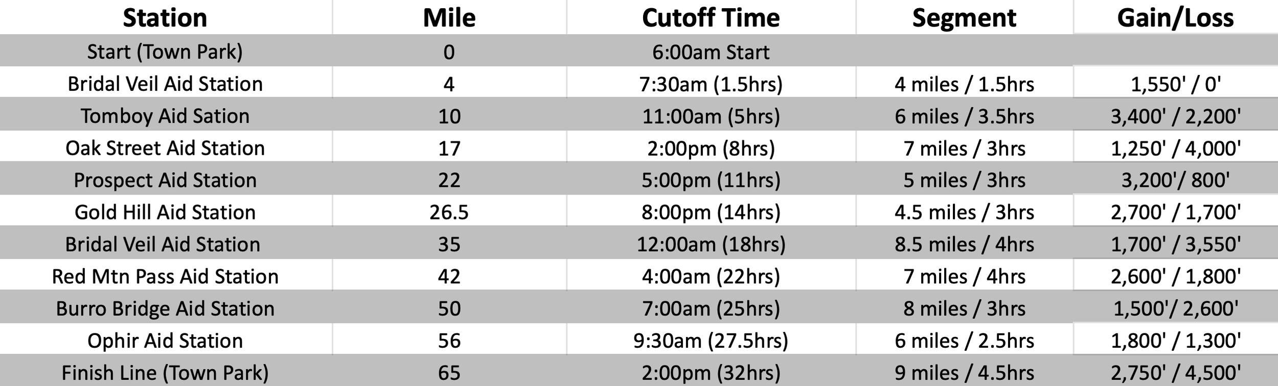 Aid Stations and Cut Off times: