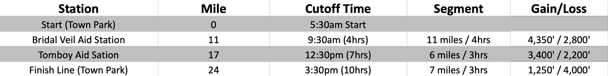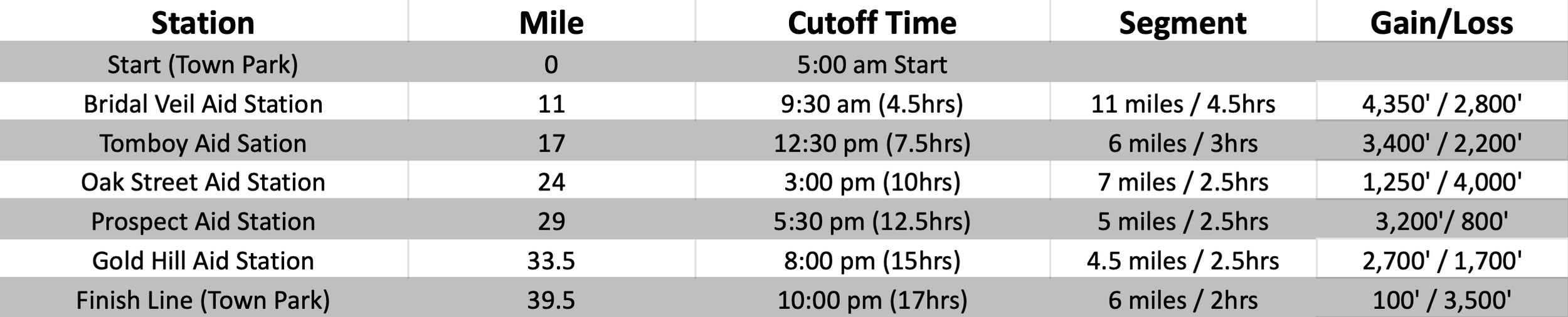 *Cut-off times will be strictly enforced for the safety of the runners. If you check into an aid station after the cut off, you MUST NOT go on.